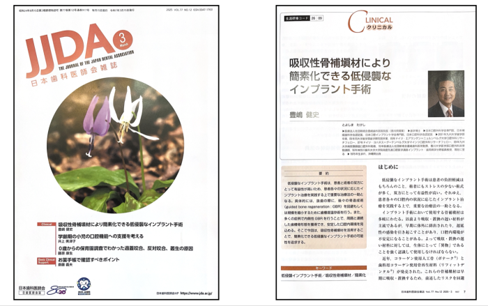 今年の日本歯科医師会雑誌3月号に「吸収性骨補填材により簡素化できる低侵襲なインプラント手術」というタイトルの論文が掲載されました。患者さんにできるだけ負担が少なく、効果の高い治療法を紹介しています。