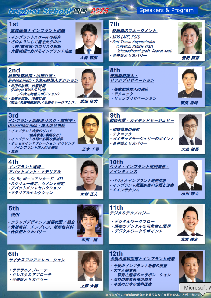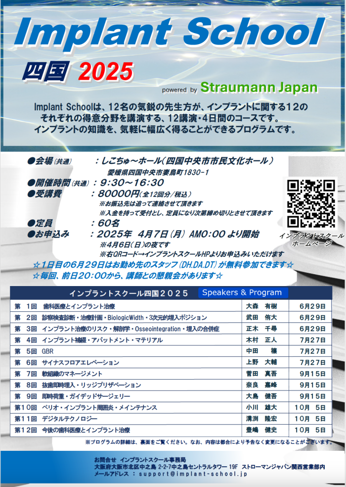 今年からインプラントスクール四国が、四国中央市を拠点として始まります。四国の若い先生が集いやすいように、四県から同じ距離の場所を選定しました。 先生方がどこでも地に足のついたインプラント治療を患者さんに提供されますようお手伝いします。